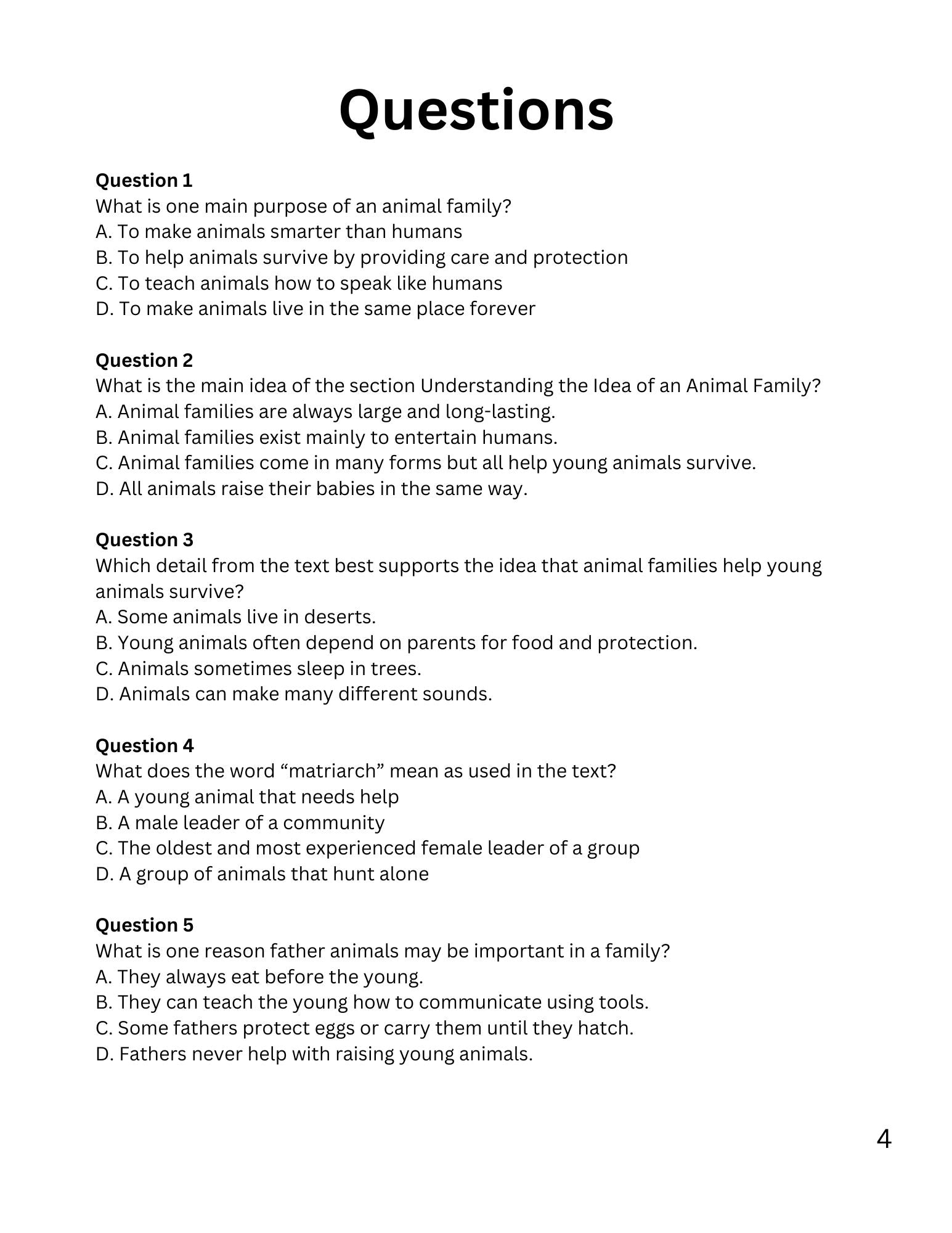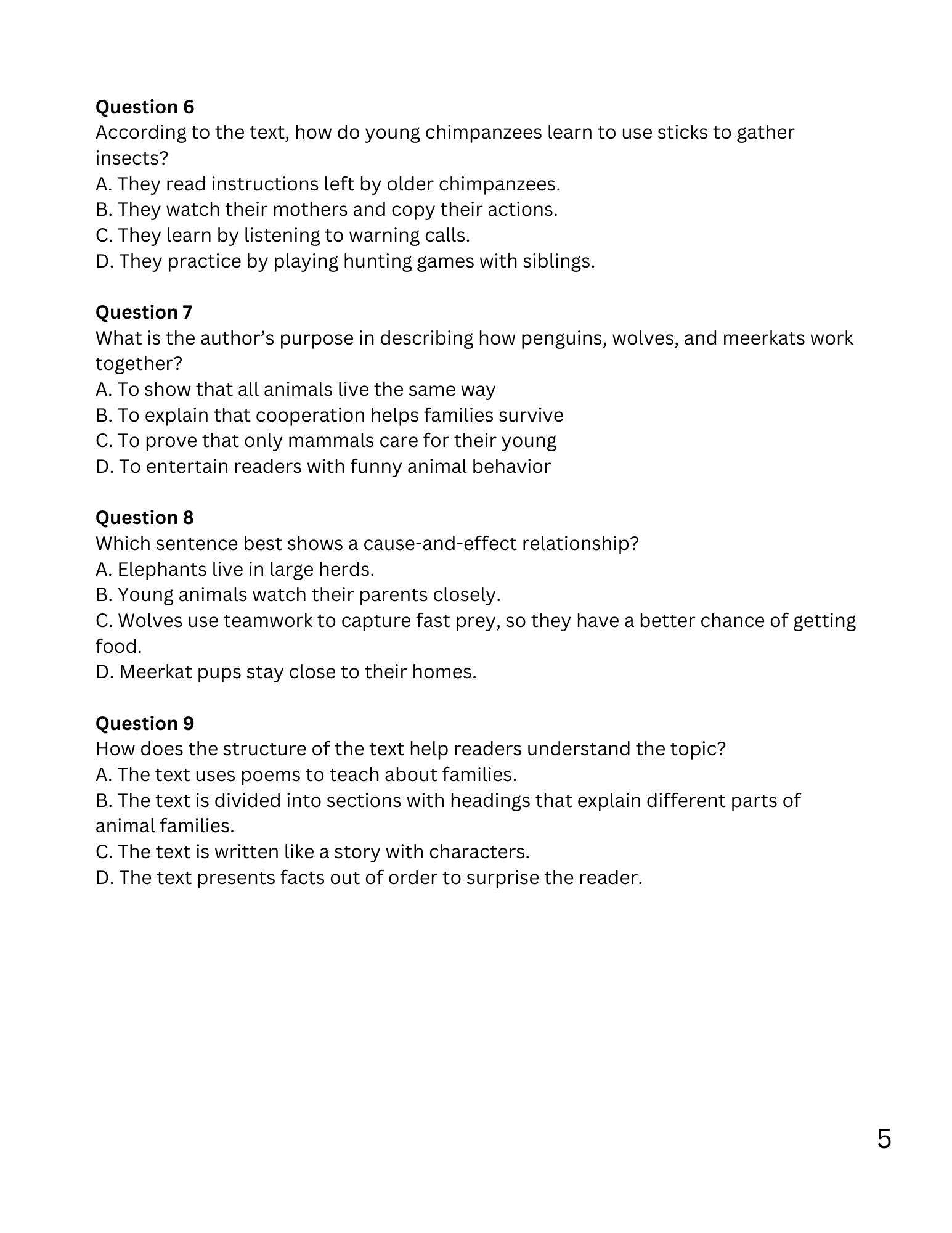 WIZ KIDS READING TEST GRADE 5: ANIMAL FAMILIES